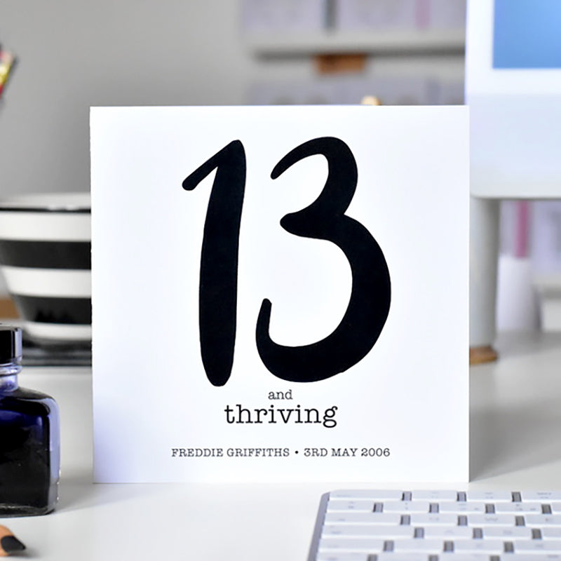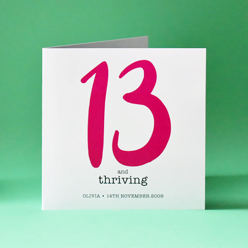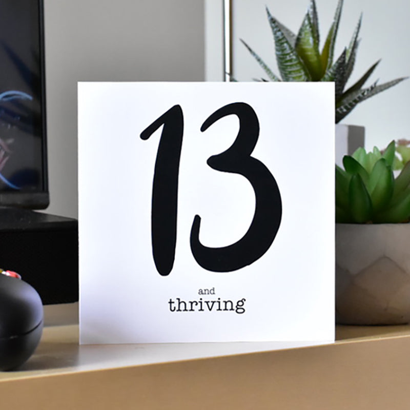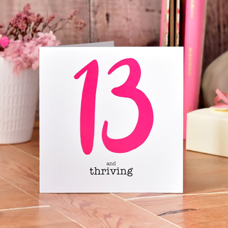 The large number 13 is available in either bright pink or black. The wording on the card reads "13 and Thriving".