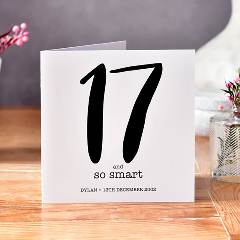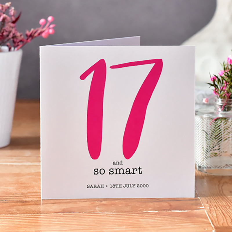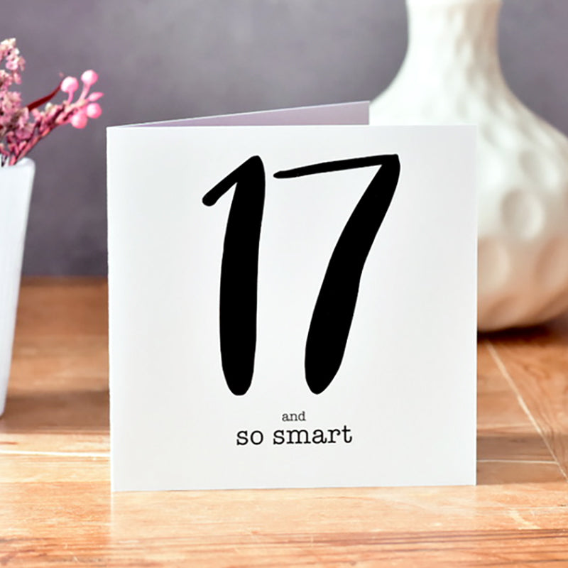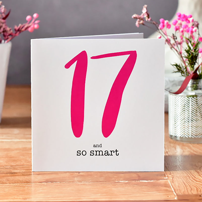The large “17” on the front comes in your choice of bright pink or black, offering a sleek, cool look that suits any teenager’s style. The words “17 and So Smart” add a fun, confident touch, making it a perfect card for teens who are all about feeling grown-up while still having a little fun.