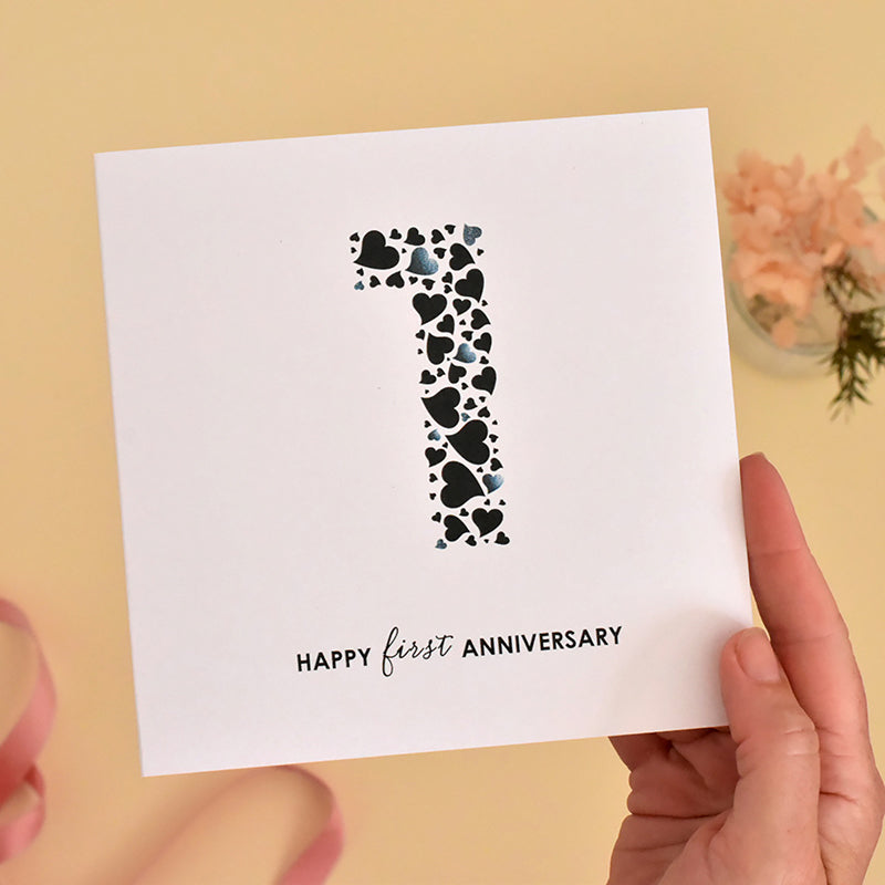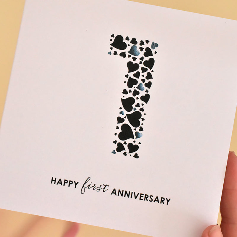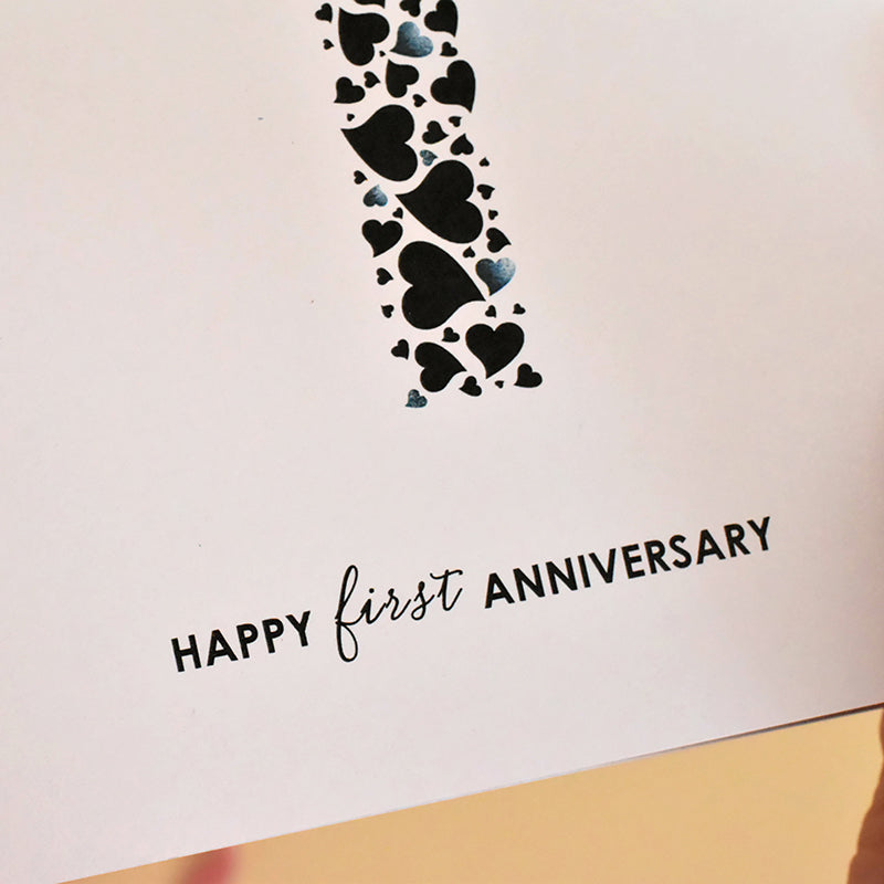 Perfect for congratulating a happy couple on this special milestone, the centre piece of the design is the number "1," crafted from an array of black love hearts in various sizes and styles.