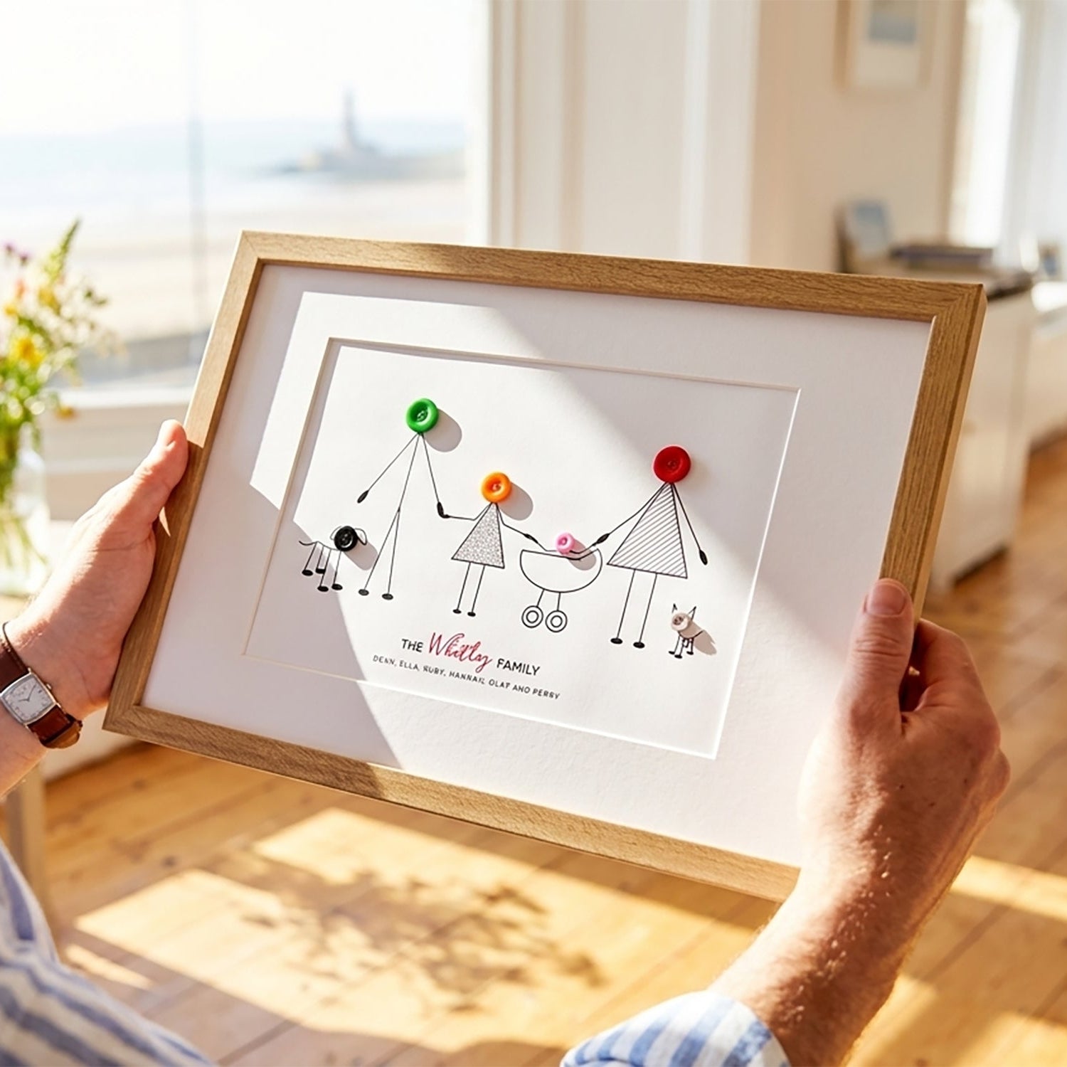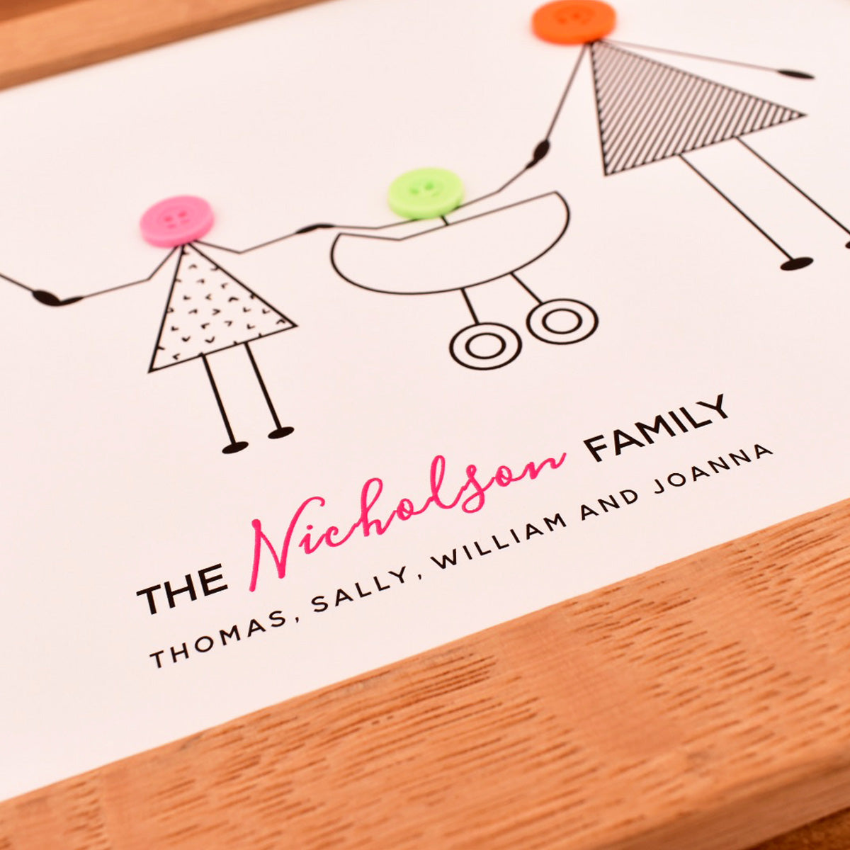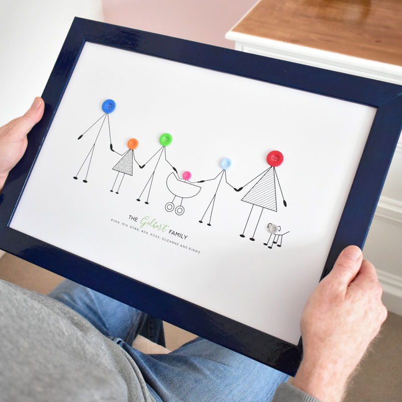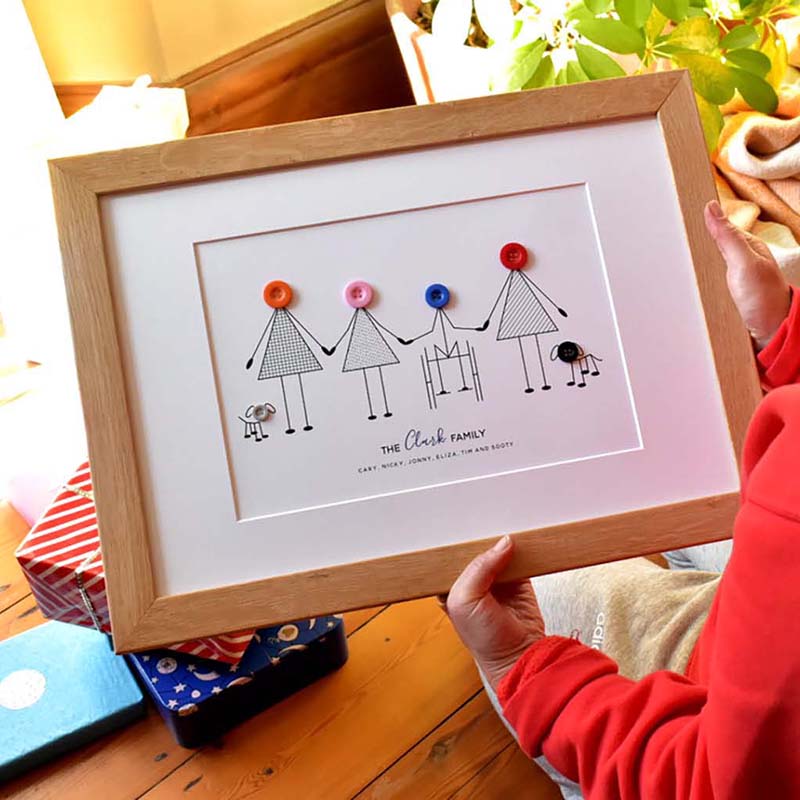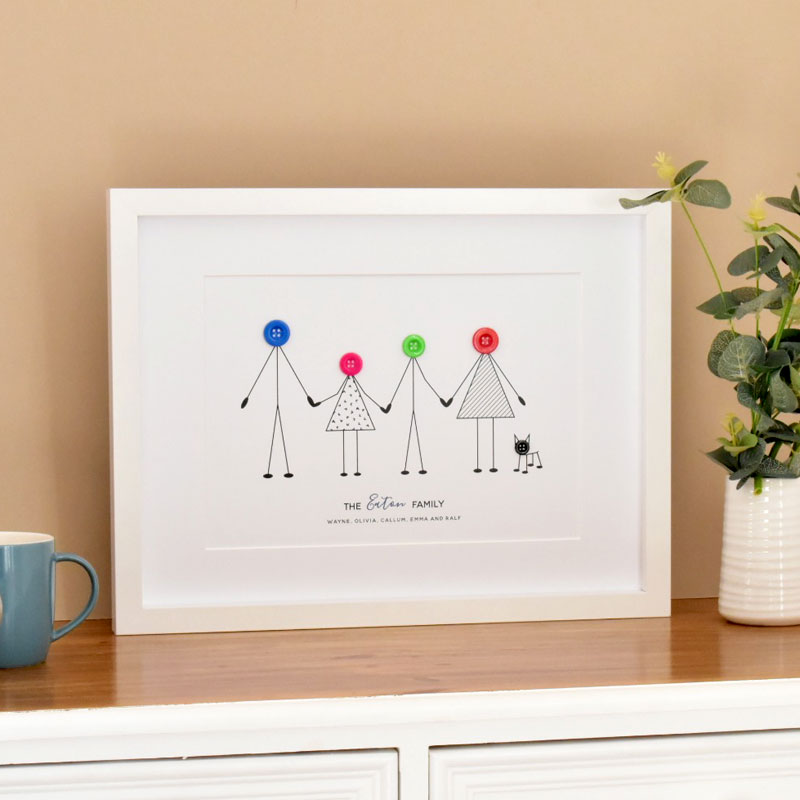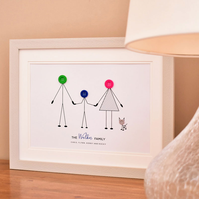 The button people family print has been a favourite for over a decade. This unique and sentimental gift is perfect for various occasions such as Christmas, Father’s Day, Mother’s Day, housewarmings and new baby celebrations. Parents and grown-up children buying for their parents find this print especially appealing.
