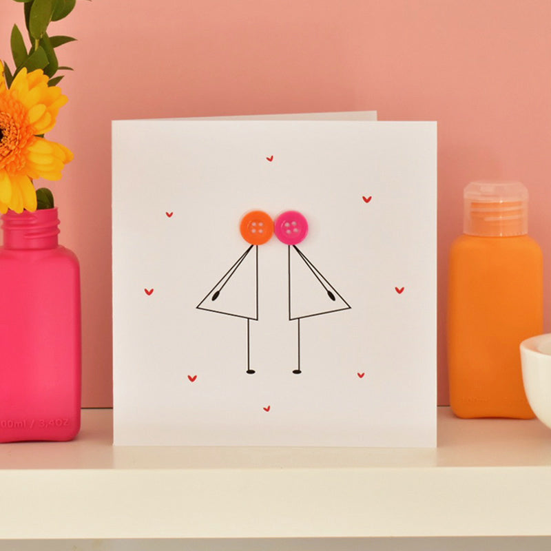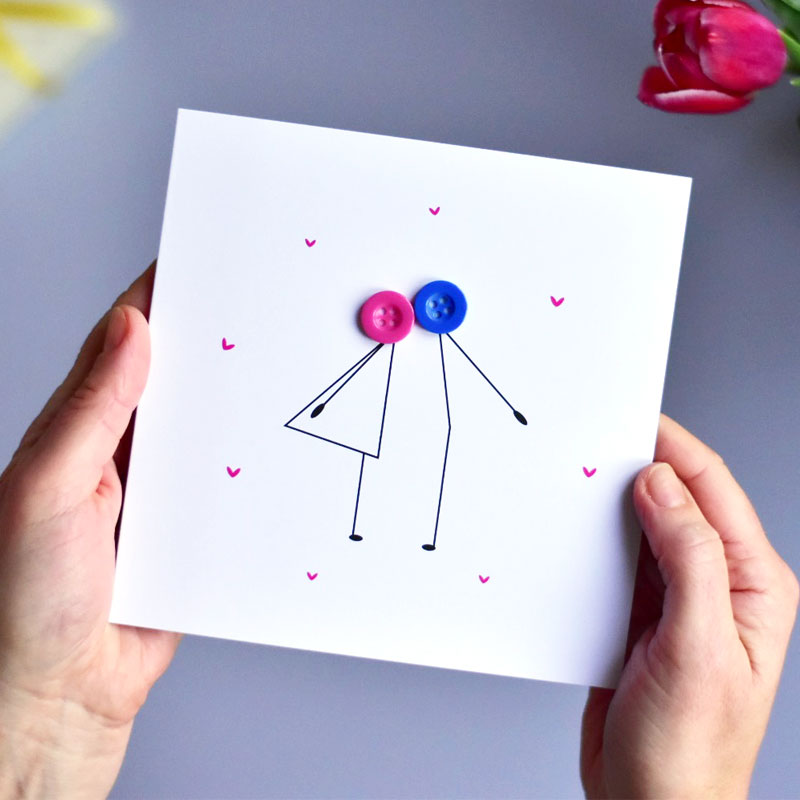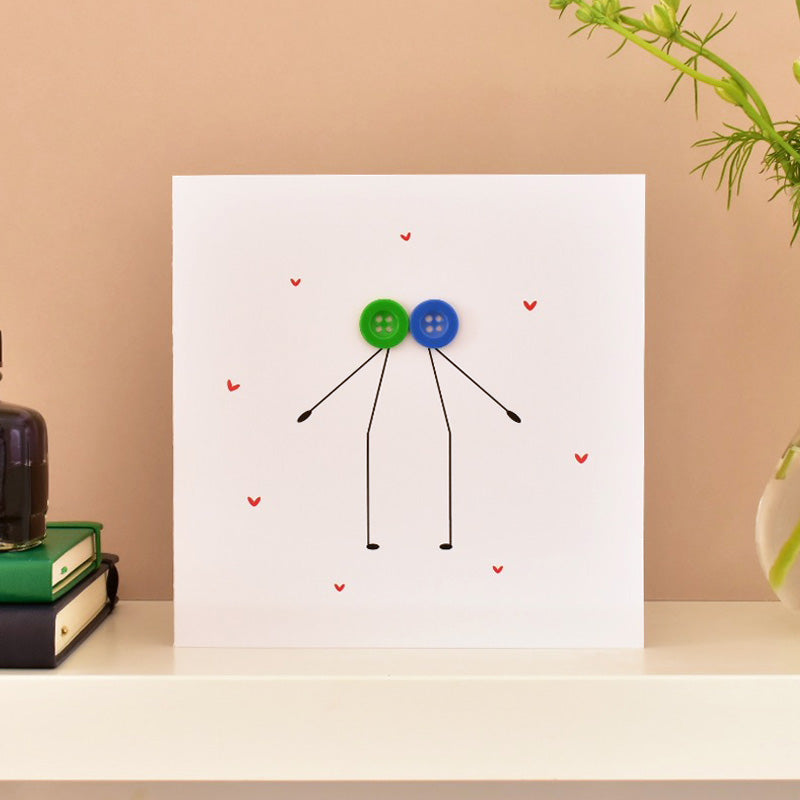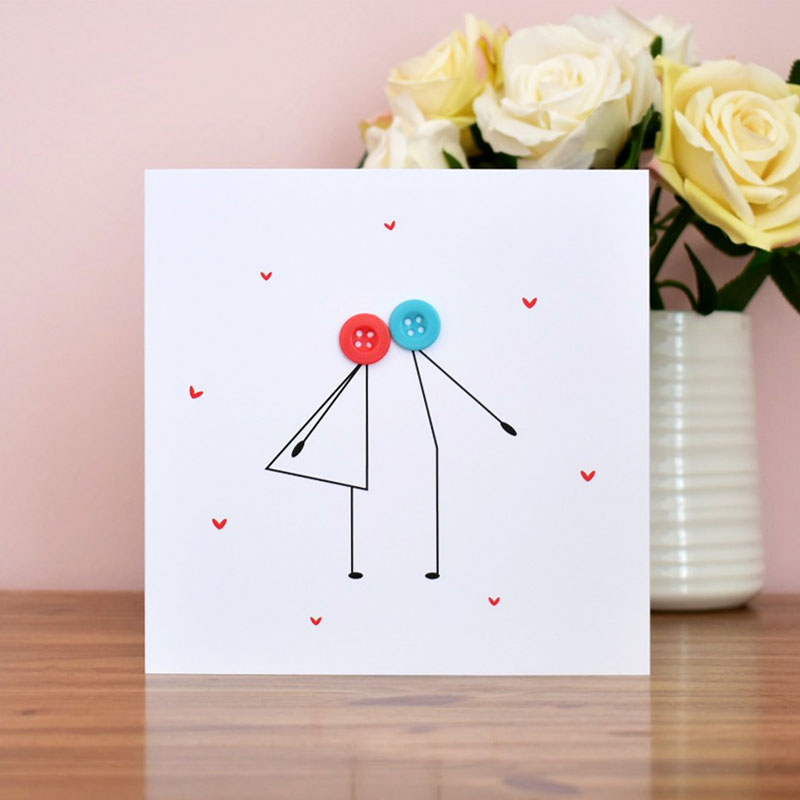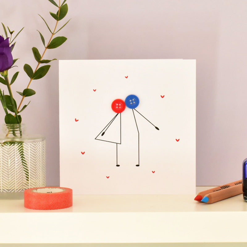 This greetings card is special in its simplicity. Two button people kissing and a few discrete love hearts surrounding them. There are no words on the card so it is versatile for any occasion such as an anniversary card, wedding card, Valentine's card or just to tell them you love them.