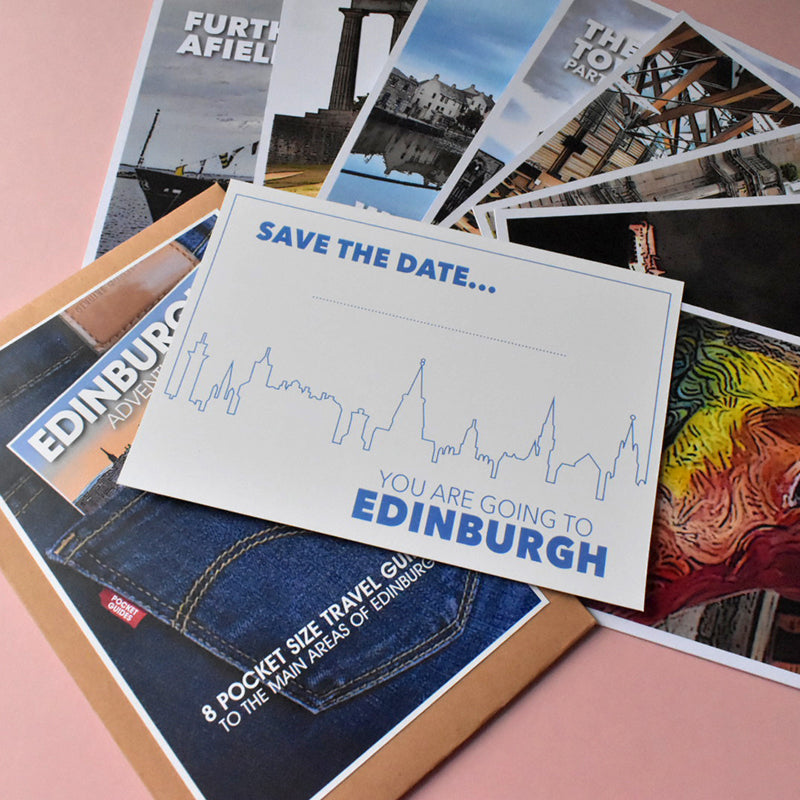 • A "Save the Date, you are going to Edinburgh" card featuring the Edinburgh skyline.