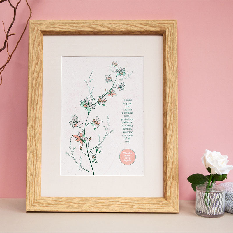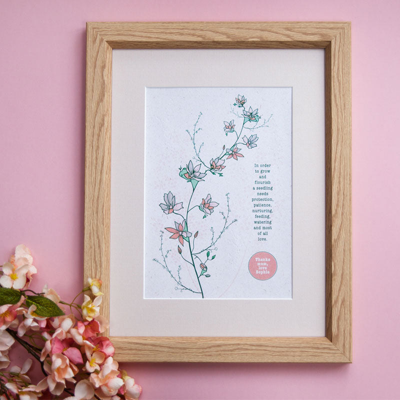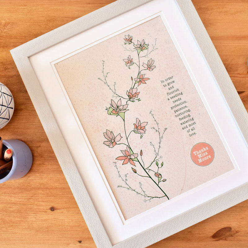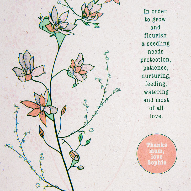 A natural floral illustration print to gift to mums, teachers or a teaching assistants or relatives to thank them for their love and support during your growth. Printed on natural flecked card.