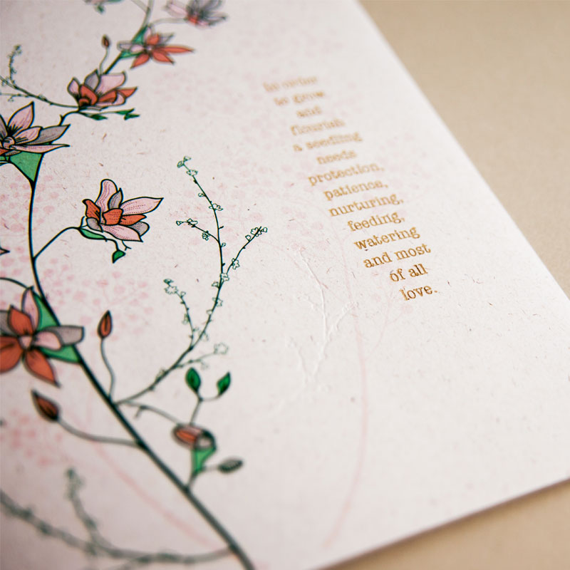 The wording on the print reads "In order to grow and flourish a seedling needs protection, patience, nurturing, feeding, watering and most of all love."