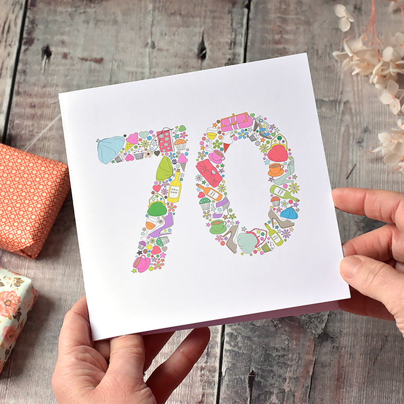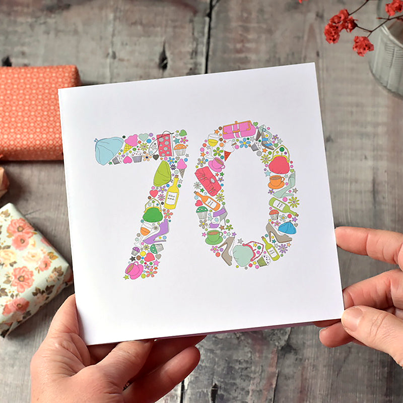 If you are looking for a jovial 70th birthday card for your wife, a female friend or relative this charming "girlie things" birthday card is an attractive choice. The number 70 is made up of a selection of items: handbags, cupcakes, glasses and bottles of wine, flowers, ice-cream, shoes and cups of tea, all in complementary colours, some of all of which will be loved by the recipient.