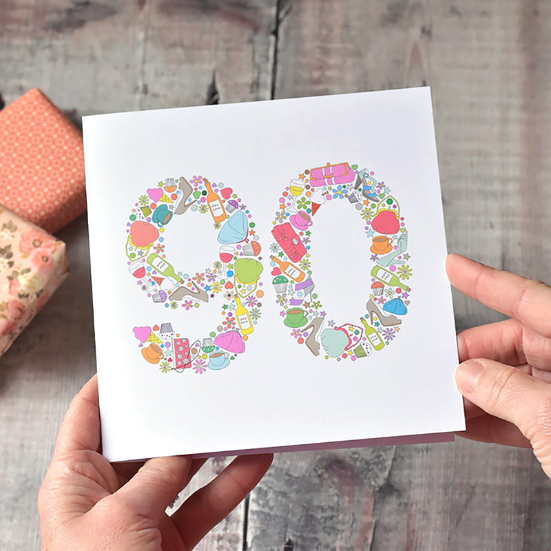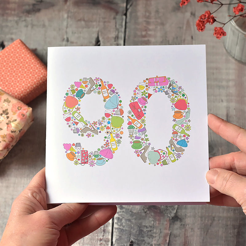 This 90th birthday card for her boasts a vibrant, oversized '90' crafted from candy coloured illustrations of cherished hobbies and interests; cupcakes, cups of tea, handbags, shoes, flowers and more.