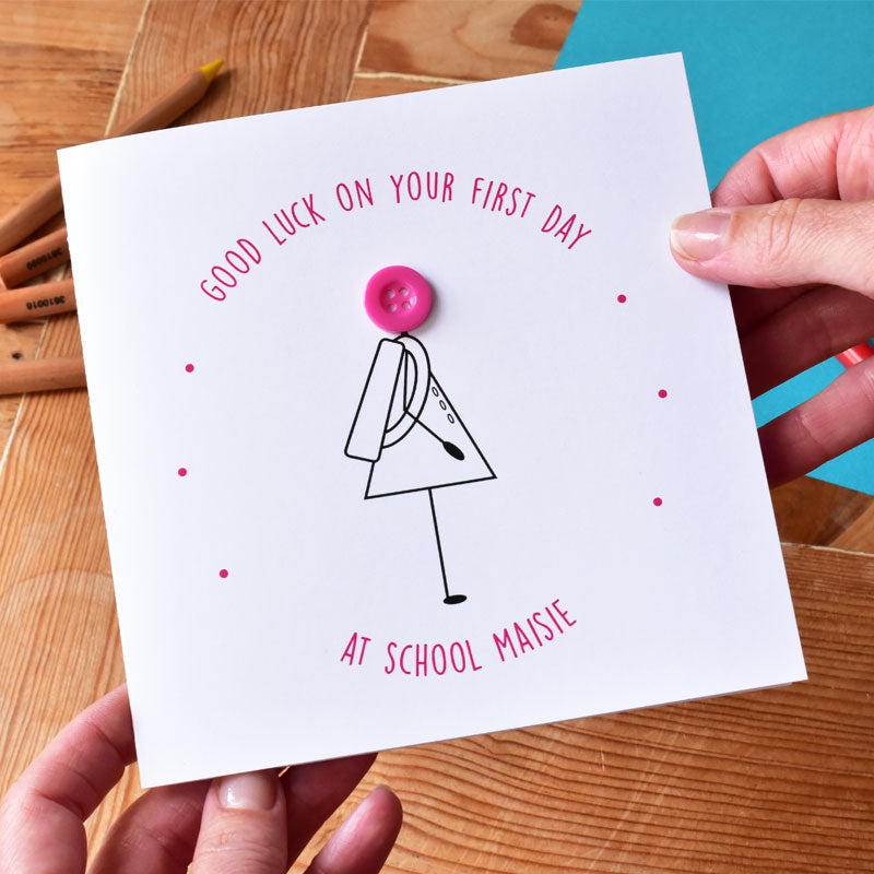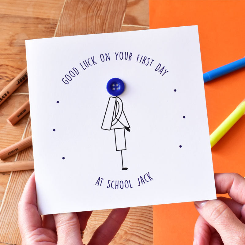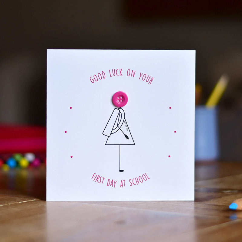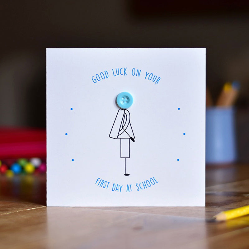 The wording on the card reads "Good luck on your first day at school" capturing the excitement and anticipation of this special day.