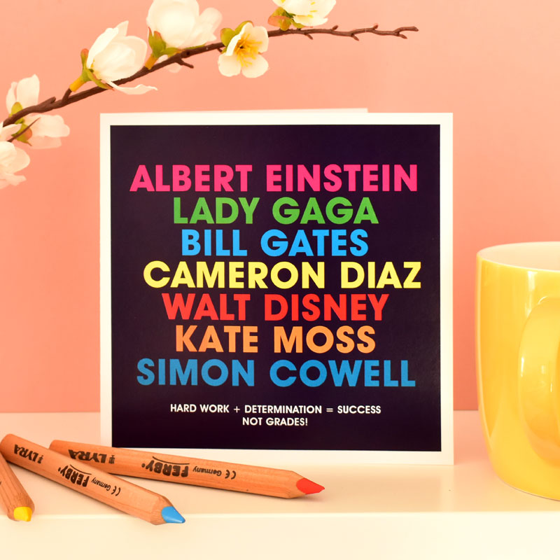 The wording on the card reads "Albert Einstein, Lady Gaga, Bill Gates, Cameron Diaz, Walt Disney, Kate Moss, Simon Cowell. Hard Work + Determination = Success, Not Grades".