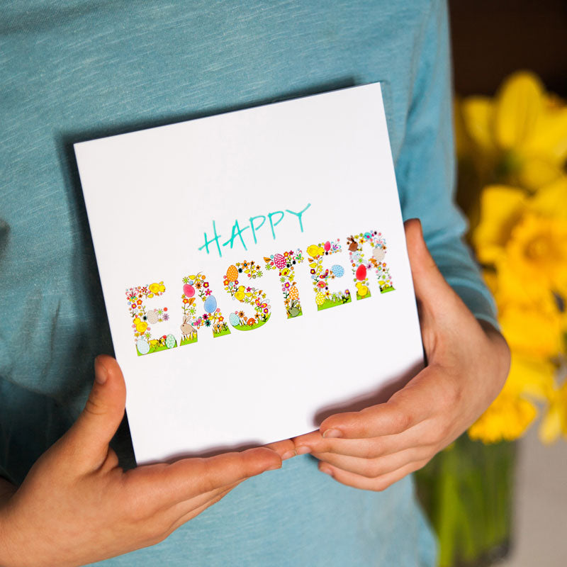 The word ‘Easter’ is creatively formed from delightful hand drawn illustrations that symbolise new life and the joy of spring; Easter eggs, blooming flowers, lush grass, playful chicks, fluttering butterflies and adorable bunnies all come together to create a truly unique and heartwarming design.