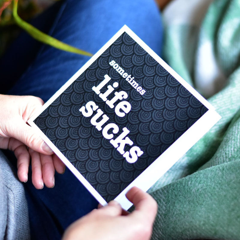 The design is a circular pattern on a black background. The wording on the card reads "Sometimes Life Sucks".