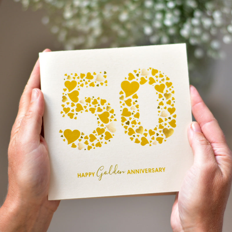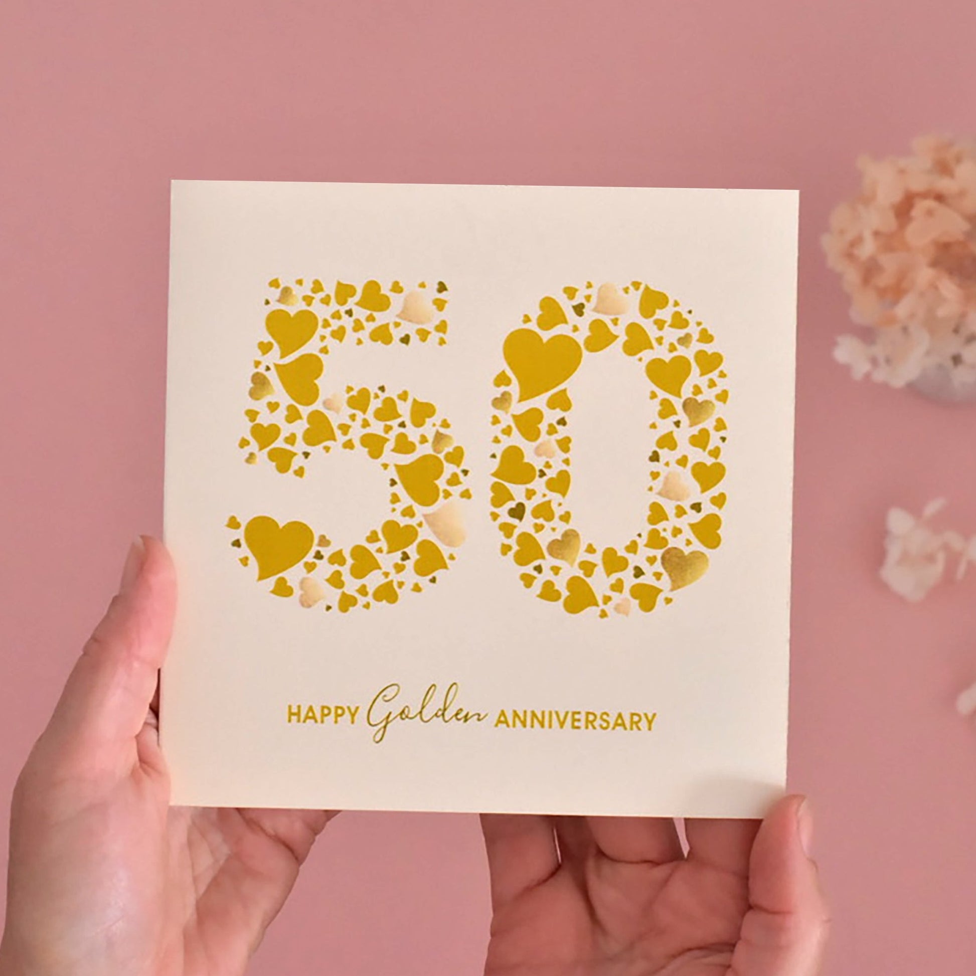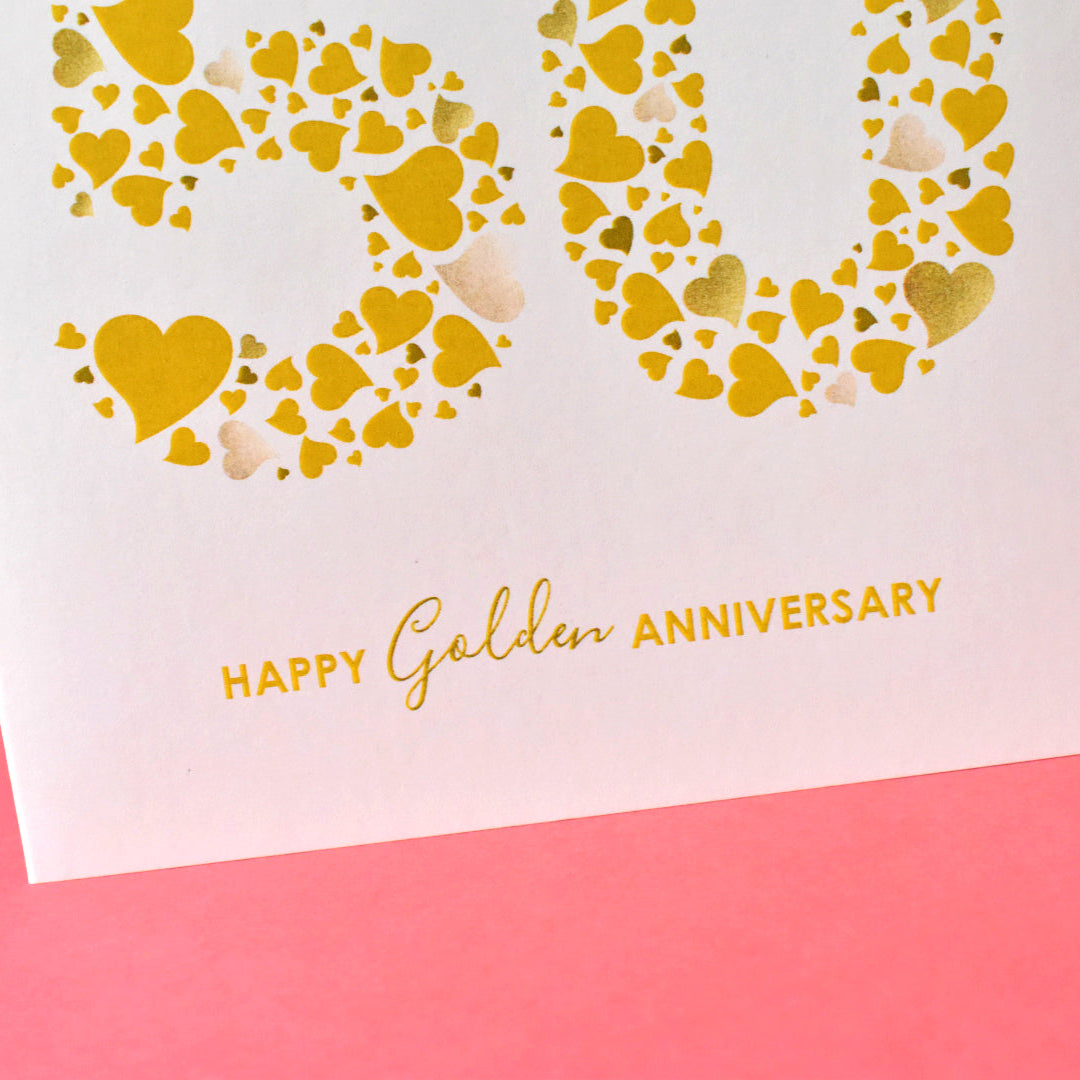 The focal point of the design is the number "50," meticulously crafted from an array of radiant gold love hearts, each varying in size, shade, and style. These lovingly adorned hearts come together on a cream card, creating a captivating and visually stunning composition.