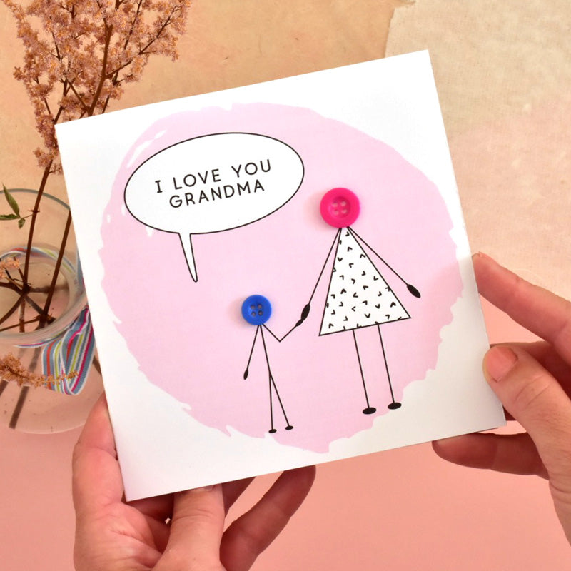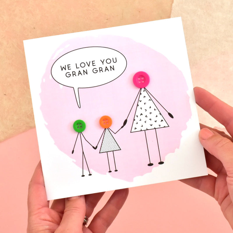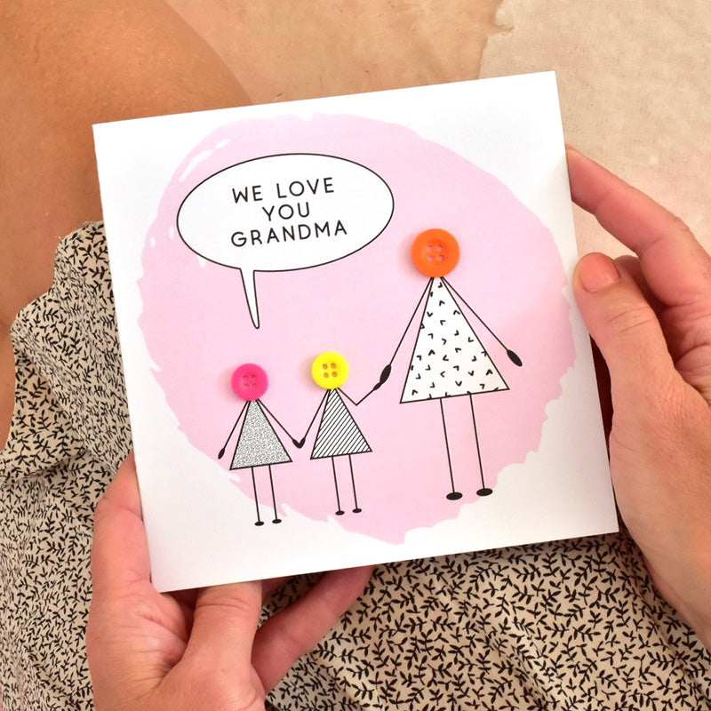 The card features Grandma and her precious grandchildren, hand in hand, illustrated in an adorable stick figure style with colourful button heads. The charm of this design lies in the simple yet profound connection it represents, making it a gesture she’ll treasure forever.