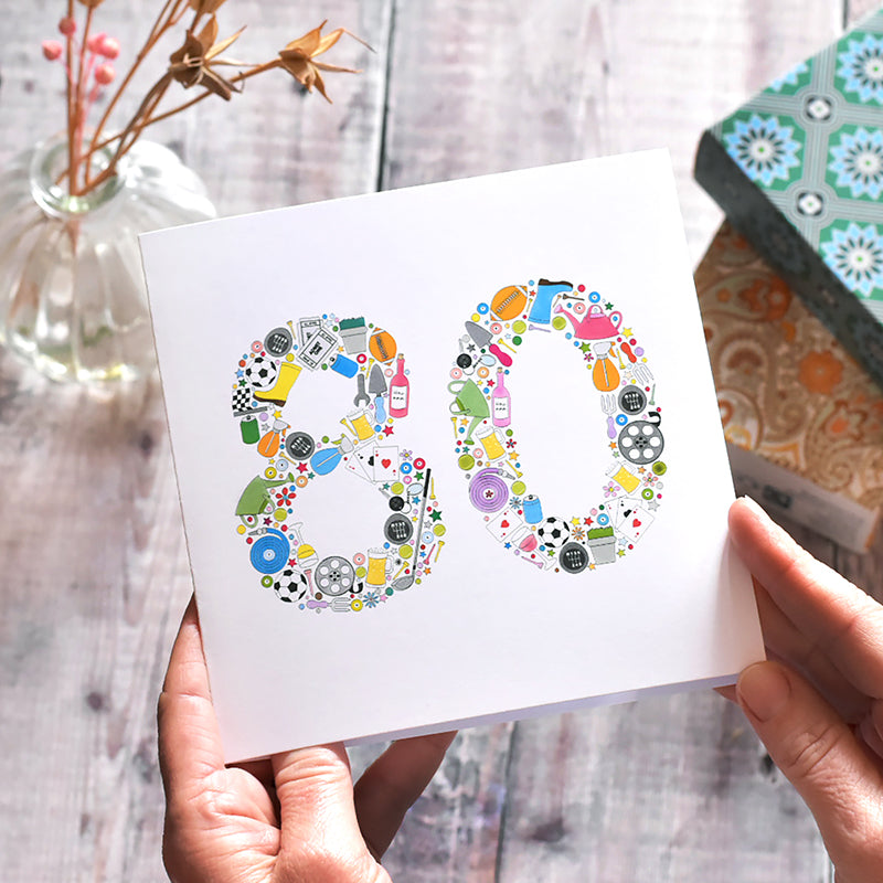 This card is simple, fun and colourful with an arrangement of bright illustrations that form the number 80 on a clean white background. All the drawings are in fresh, bold colours and they depict "typical" male hobbies and items relating to these hobbies such as pints of ale, playing cards, gardening tools, car keys, footballs and glasses of wine amongst other things.