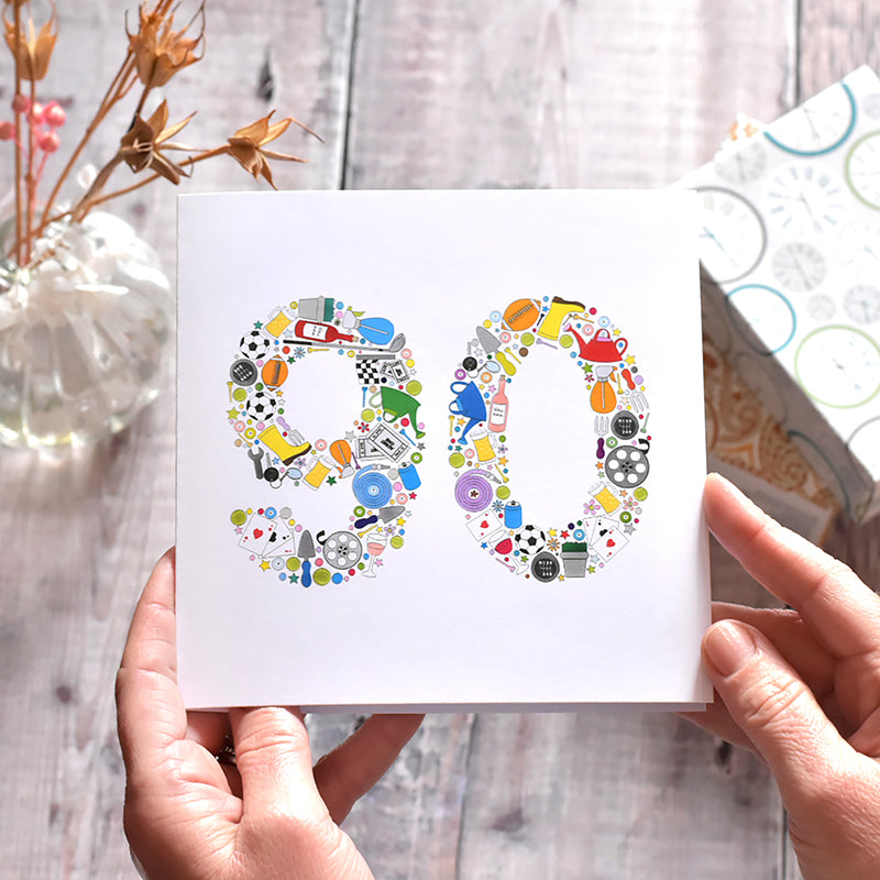 This 90th birthday card has a really big number 90 made up of colourful illustrations of "mens" things such as beer, golf clubs, gardening tools, snooker balls and more.