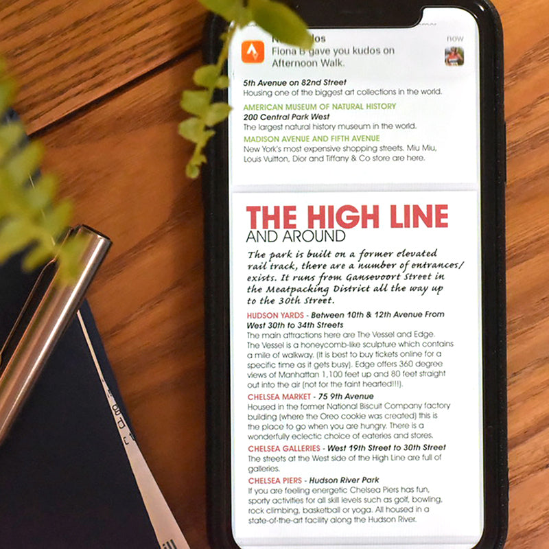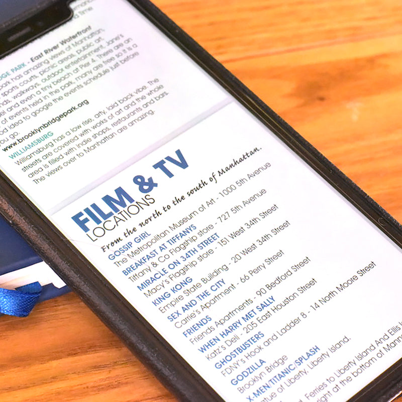 • Travel Guides to the main districts of New York; Central Park and the Upper West and Upper East Side, The High Line and around, Lower Manhattan, Midtown Manhattan and Brooklyn Bridge and Dumbo. All A6 in size so perfect handbag/back pocket size.