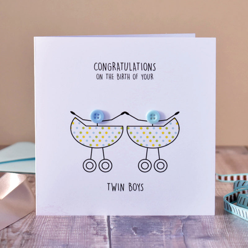 The card features an adorable image of twin boys in prams, hand in hand, with button heads in pastel blue. A heartwarming way to congratulate the proud parents