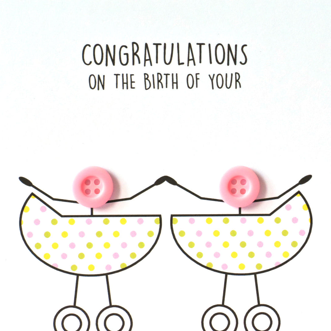 This newborn twins card showcases two adorable newborns in prams, holding hands, with button heads in pretty pastel pink. Both prams are patterned in contrasting pastel spots, making it a delightful way to celebrate this double bundle of joy.