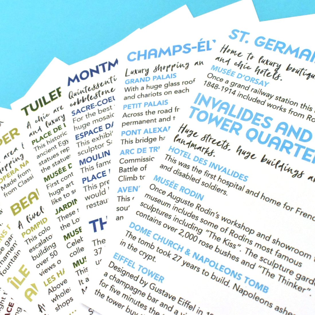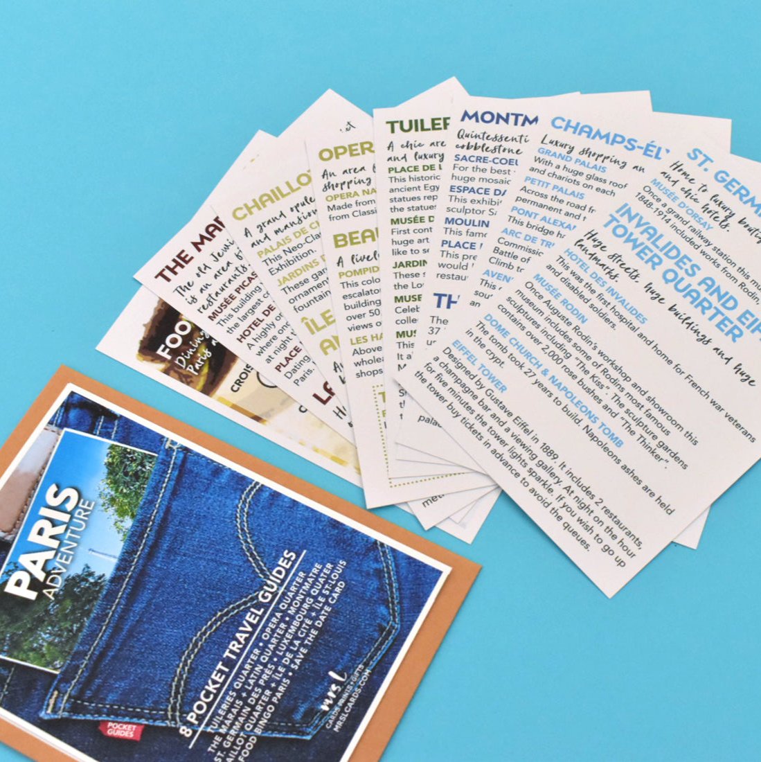 The travel guide is compact, easy to carry and printed on thick card stock. Each A6 portrait card, printed on both sides, is housed in a robust cardboard gusset envelope with a convenient string mechanism at the back.