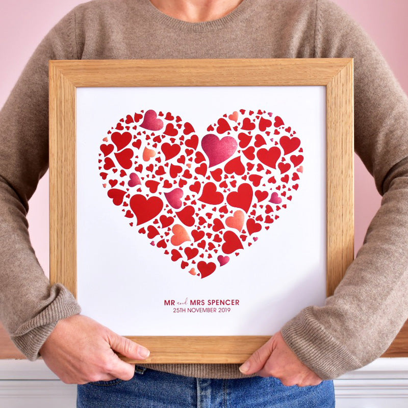 Personalise the print: Add the first names of the couple and the date of their wedding underneath the large love heart.