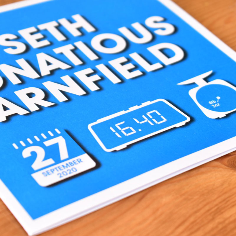 Lovely news of the arrival of a new baby? One of the first things to be mentioned when a baby is born are the vital stats such as their weight, the time they were born. To collect these things on a greetings card is really quite special. This information is shown on graphics such as a calendar, an alarm clock and scales.