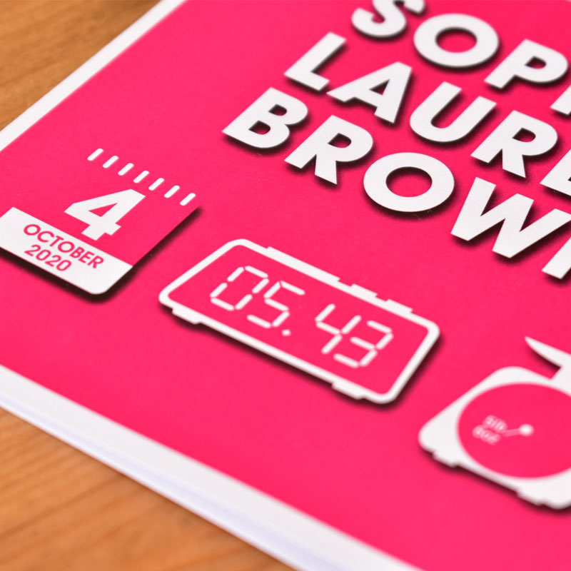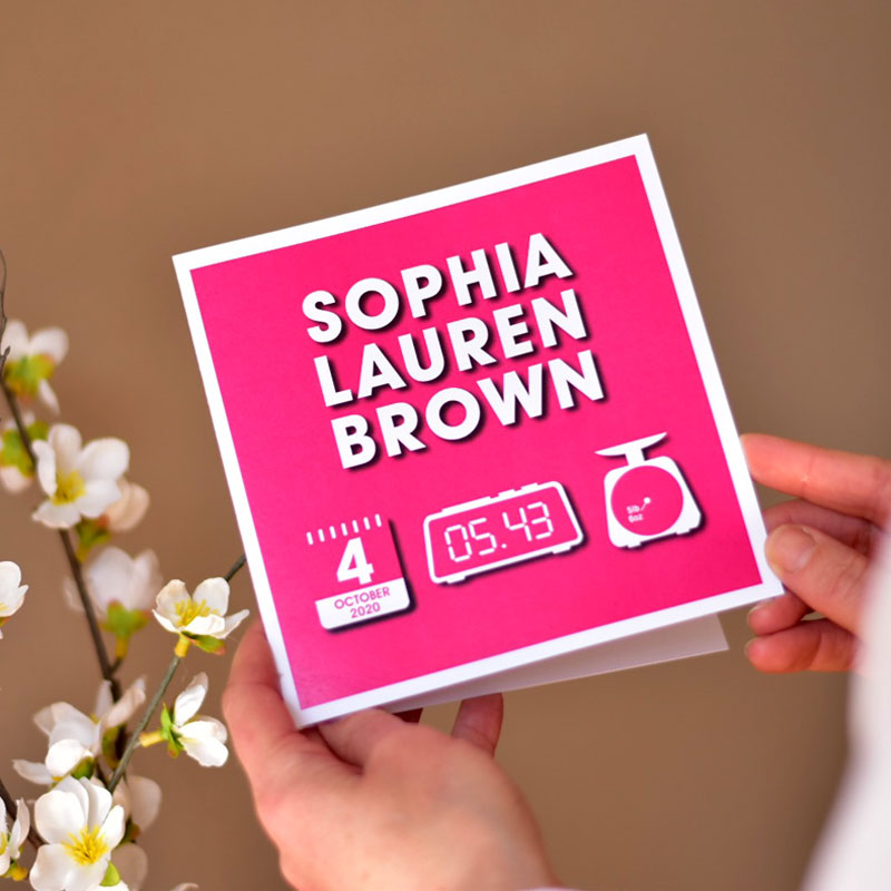 Personalise the card: Add the full name of the new baby, the date they were born, the time they were born and the weight they were when they were born to the front of the card.