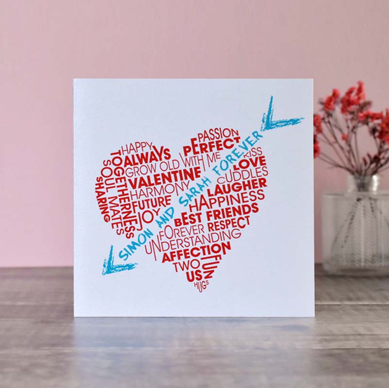 Personalise the card: Add both of your first names, they form part of the cupids arrow in turquoise which cuts through the centre of the love heart.