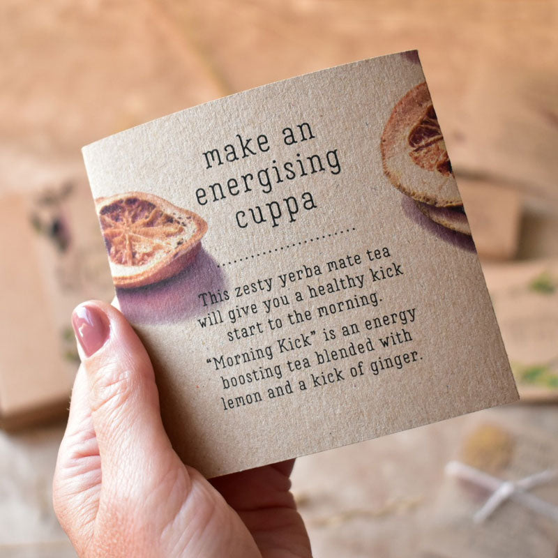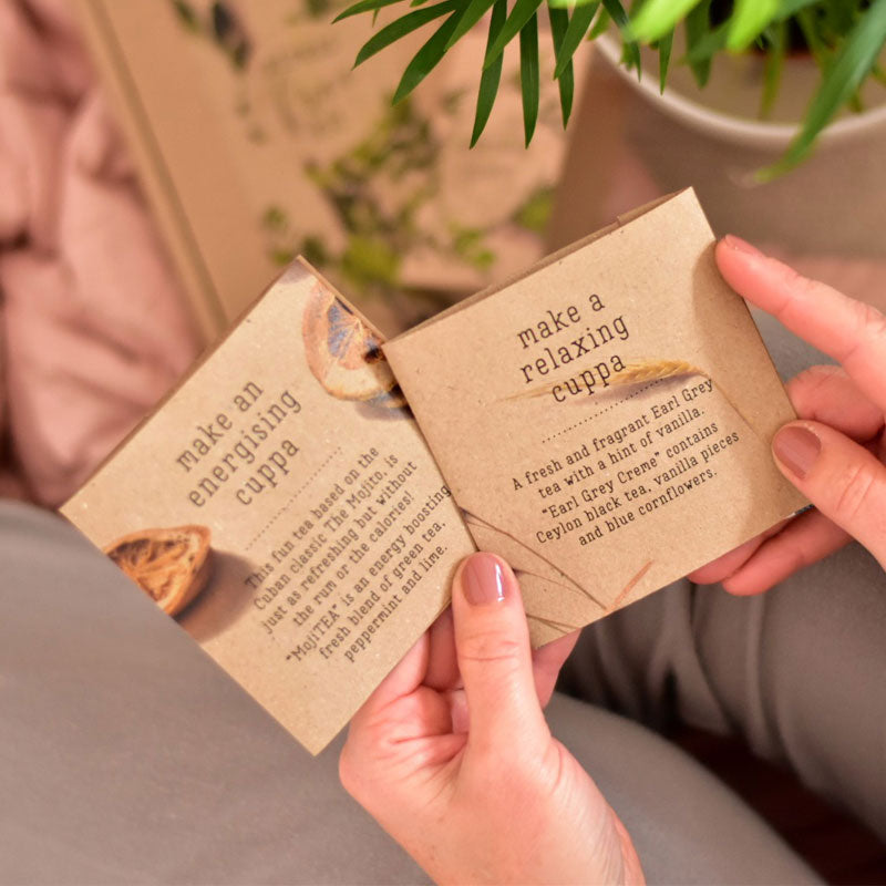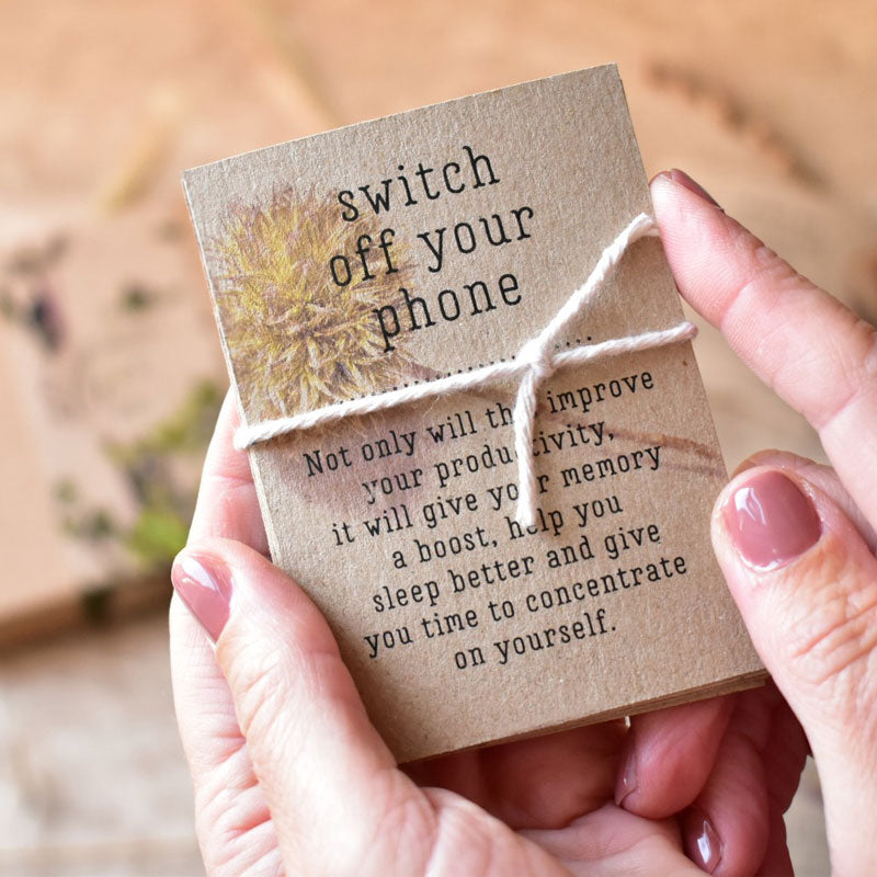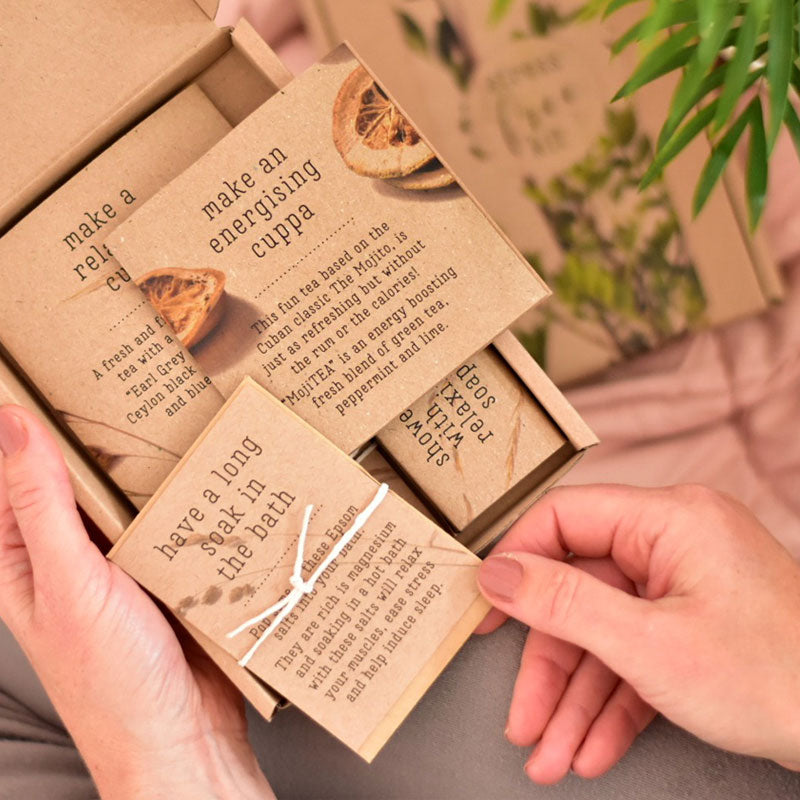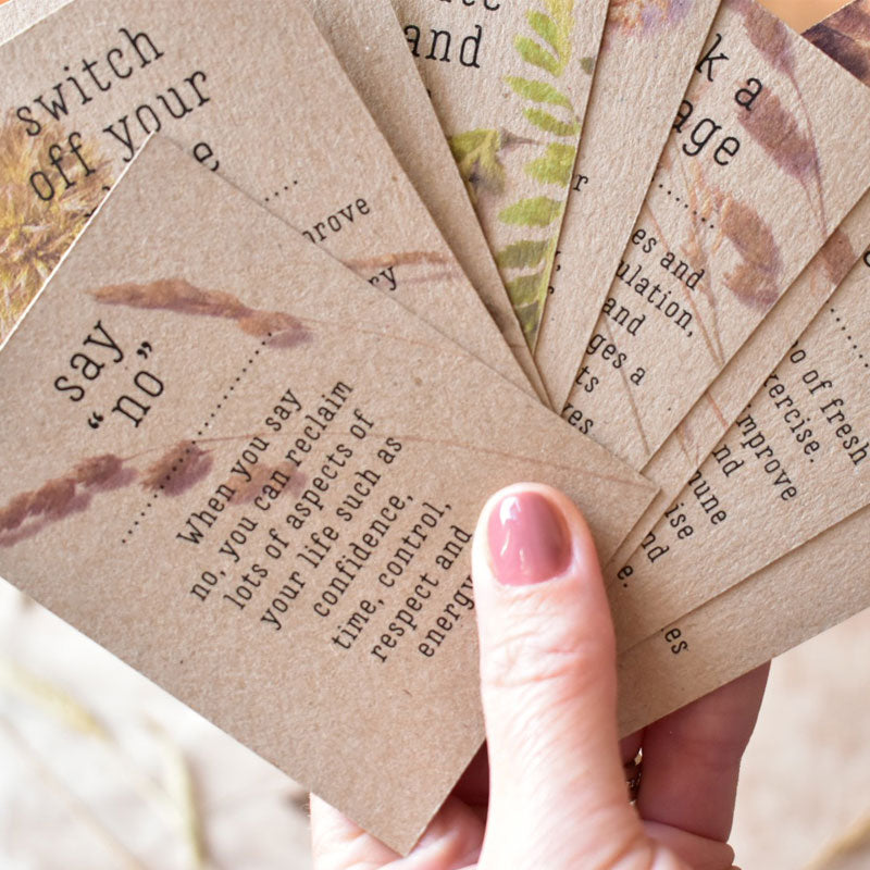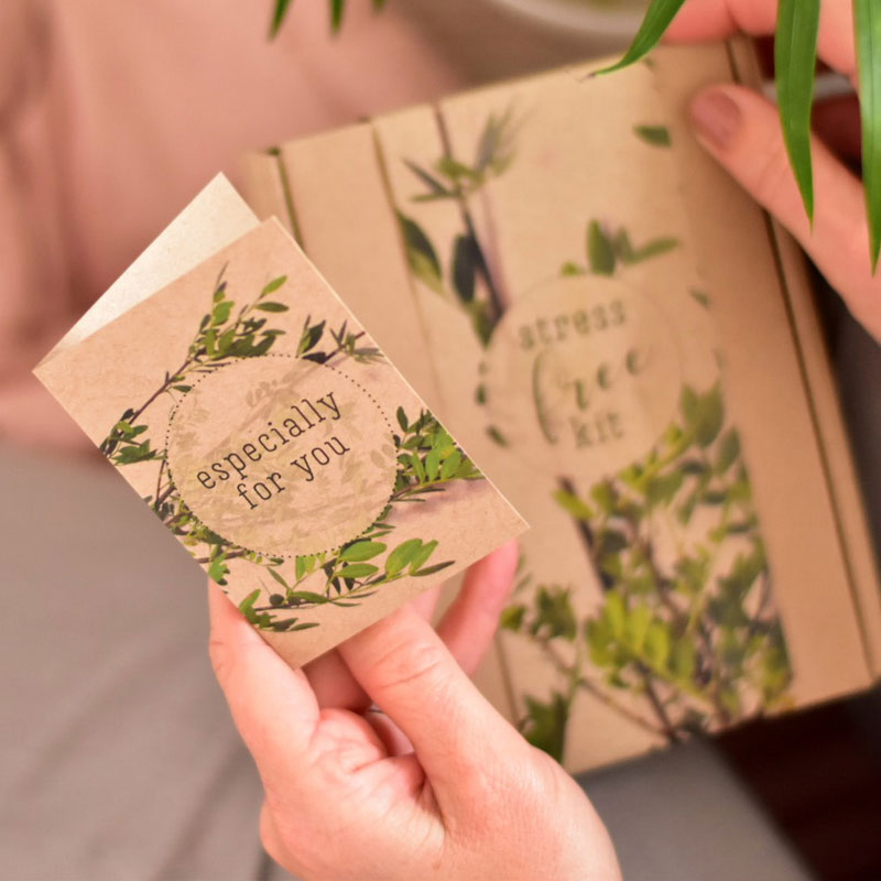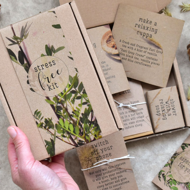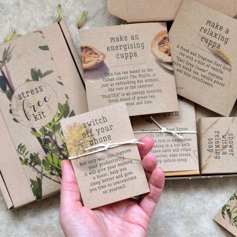 • 9 “stress less” cards with helpful hints and tips of simple free things to do that help when dealing with stressful situations. These cards are printed on recycled kraft card and wrapped in natural string.