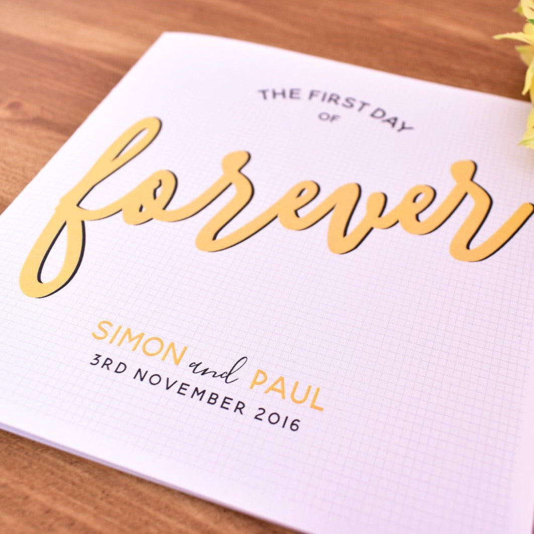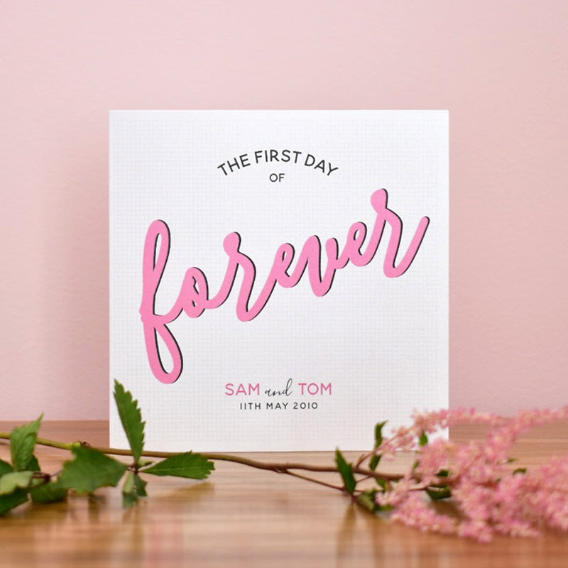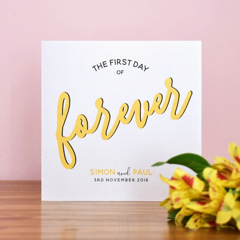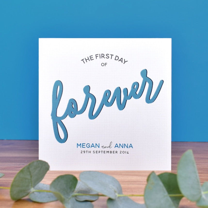 The wording on the card reads "The First Day of Forever". The word forever is picked out in a choice of three colours; dusky pink, sunflower yellow or dark turquoise. The design is printed on pearlescent white card with a shimmering effect for that extra special touch, perfect such a momentous occasion.