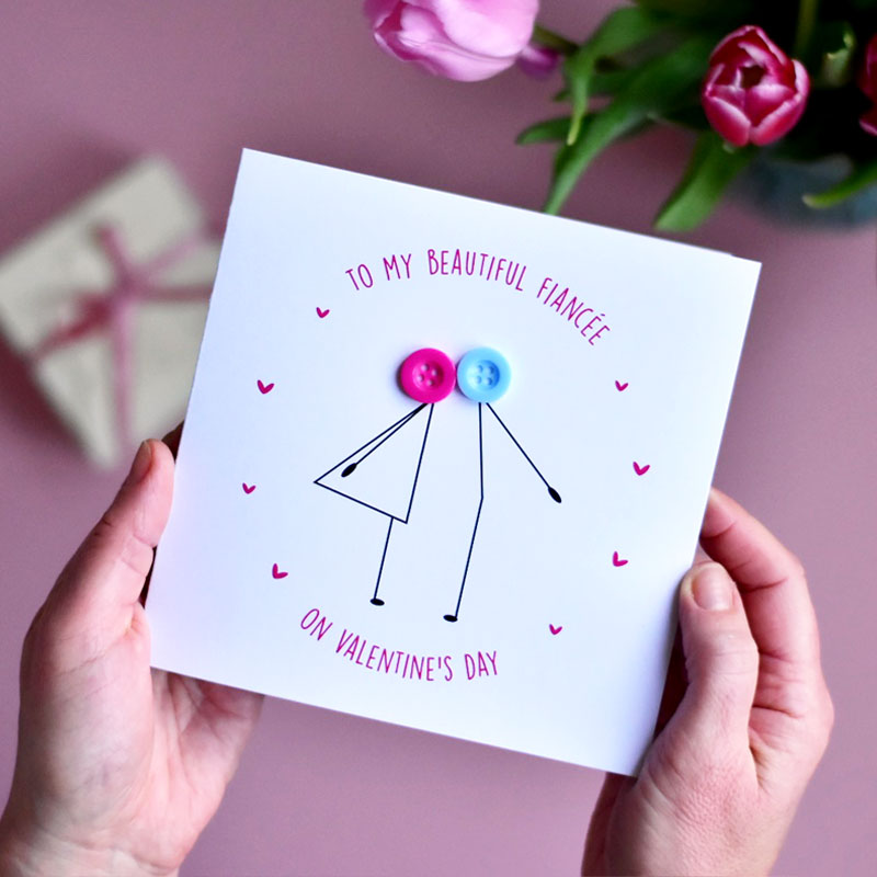 Celebrate your incredible fiancée with this delightful Valentine’s Day card, designed to bring a smile to her face. A delicate line illustration of a couple sharing a tender moment is elevated by colourful button accents and surrounded by soft pink hearts, creating a look that’s both modern and romantic.