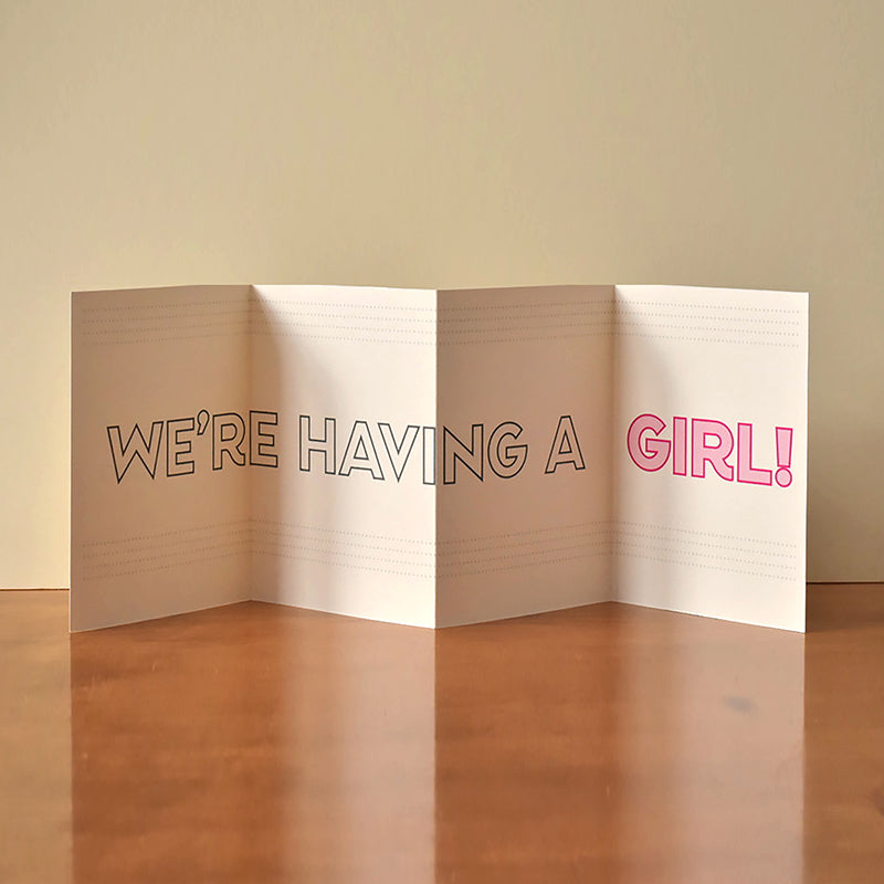 The wording on this fold out card reads on the front "So...." and inside "We're Having a Girl".